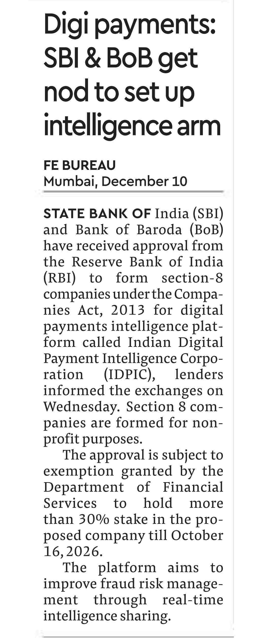 Digi payments: SBI & BoB get nod to set up intelligence arm FE BUREAU Mumbai, December 10 STATE BANK OF India (SBI) and Bank of Baroda (BOB) have received approval from the Reserve Bank of India (RBI) to form section-8 companies under the Companies Act, 2013 for digital payments intelligence platform called Indian Digital Payment Intelligence Corporation (IDPIC), lenders informed the exchanges on Wednesday. Section 8 companies are formed for nonprofit purposes.