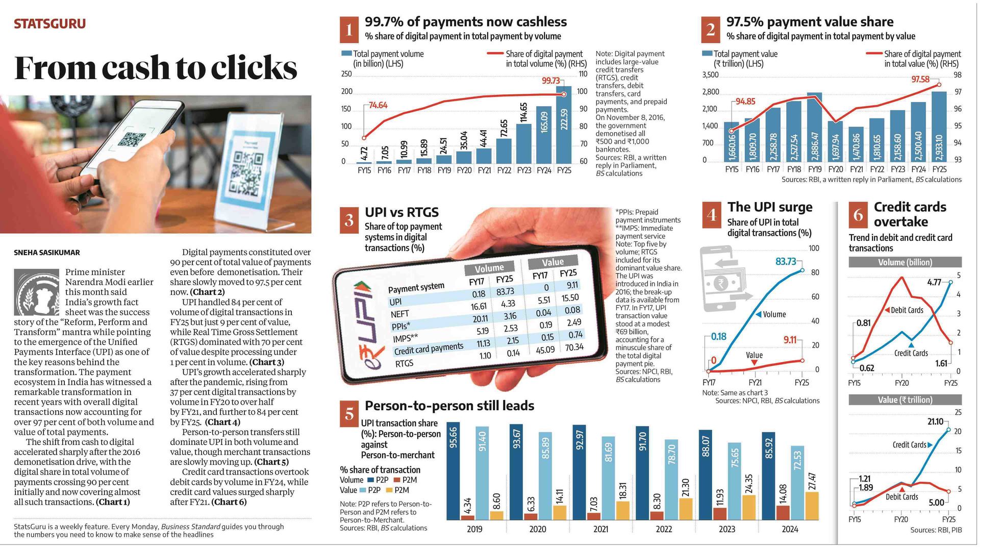 Sources: RBI, a written reply in Parliament, BS calculations Digital payments constituted over 90 per cent of total value of payments even before demonetisation. Their share slowly moved to 97.5 per cent now. (Chart 2) UPI handled 84 per cent of volume of digital transactions in FY25 but just 9 per cent of value, while Real Time Gross Settlement (RTGS) dominated with 70 per cent of value despite processing under 1 per cent in volume. (Chart 3) UPI's growth accelerated sharply after the pandemic, rising from 37 per cent digital transactions by volume in FY20 to over half by FY21, and further to 84 per cent by FY25. (Chart 4) Person-to-person transfers still dominate UPI in both volume and value, though merchant transactions are slowly moving up. (Chart 5) Credit card transactions overtook debit cards by volume in FY24, while credit card values surged sharply after FY21. (Chart 6) StatsGuru is a weekly feature. Every Monday, Business Standard guides you through the numbers you need to know to make sense of the headlines 2 97.5% payment value share