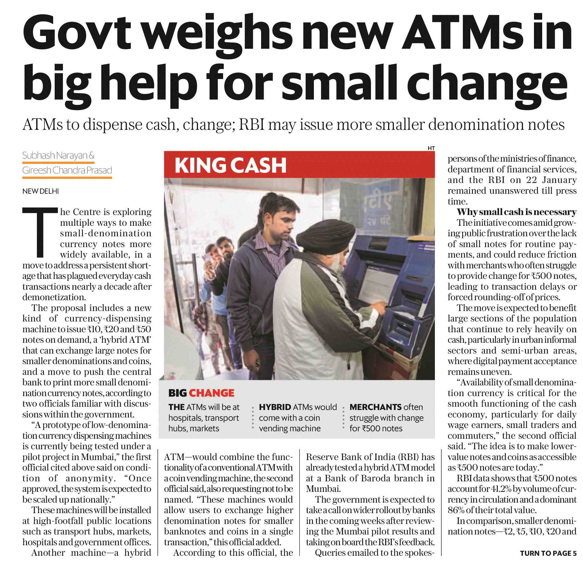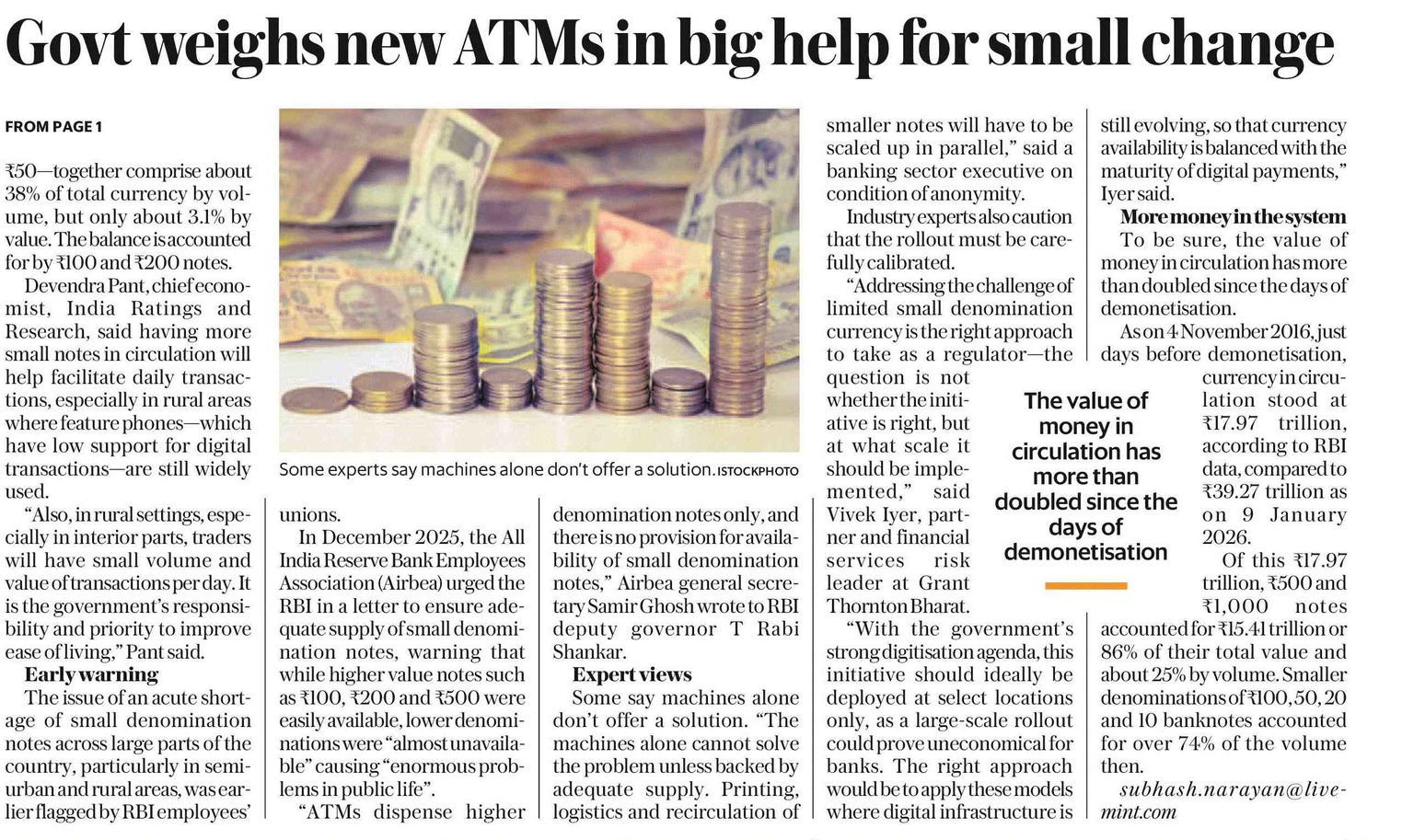 In comparison, smaller denomination notes-₹2, 5, 10, 20 and TURN TO PAGE 5Govt weighs new ATMs in big help for small change FROM PAGE 1 ₹50-together comprise about 38% of total currency by volume, but only about 3.1% by value. The balance is accounted for by ₹100 and ₹200 notes. Devendra Pant, chief economist, India Ratings and Research, said having more small notes in circulation will help facilitate daily transactions, especially in rural areas where feature phones-which have low support for digital transactions-are still widely used. "Also, in rural settings, especially in interior parts, traders will have small volume and value of transactions per day. It is the government's responsibility and priority to improve ease of living," Pant said. Early warning The issue of an acute shortage of small denomination notes across large parts of the country, particularly in semi-urban and rural areas, was earlier flagged by RBI employees' unions. In December 2025, the All India Reserve Bank Employees Association (Airbea) urged the RBI in a letter to ensure adequate supply of small denomination notes, warning that while higher value notes such as ₹100, ₹200 and ₹500 were easily available, lower denominations were "almost unavailable" causing "enormous problems in public life". "ATMs dispense higher denomination notes only, and there is no provision for availability of small denomination notes," Airbea general secretary Samir Ghosh wrote to RBI deputy governor T Rabi Shankar. Expert views Some say machines alone don't offer a solution. "The machines alone cannot solve the problem unless backed by adequate supply. Printing, logistics and recirculation of smaller notes will have to be scaled up in parallel," said a banking sector executive on condition of anonymity. Industry experts also caution that the rollout must be carefully calibrated. "Addressing the challenge of limited small denomination currency is the right approach to take as a regulator-the question is not whether the initiative is right, but at what scale it should be implemented," said Vivek Iyer, partner and financial services risk leader at Grant Thornton Bharat. "With the government's strong digitisation agenda, this initiative should ideally be deployed at select locations only, as a large-scale rollout could prove uneconomical for banks. The right approach would be to apply these models where digital infrastructure is still evolving, so that currency availability is balanced with the maturity of digital payments," Iyer said. More money in the system To be sure, the value of money in circulation has more than doubled since the days of demonetisation. As on 4 November 2016, just days before demonetisation, currency in circulation stood at ₹17.97 trillion, according to RBI data, compared to ₹39.27 trillion as on 9 January 2026. Of this ₹17.97 trillion, ₹500 and ₹1,000 notes accounted for ₹15.41 trillion or 86% of their total value and about 25% by volume. Smaller denominations of ₹100,50,20 and 10 banknotes accounted for over 74% of the volume then. subhash.narayan@live-mint.com