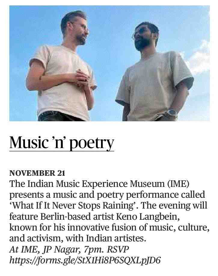 The Indian Music Experience Museum (IME) presents a music and poetry performance called ‘What If It Never Stops Raining’. The evening will feature Berlin-based artist Keno Langbein, known for his innovative fusion of music, culture, and activism, with Indian artistes.