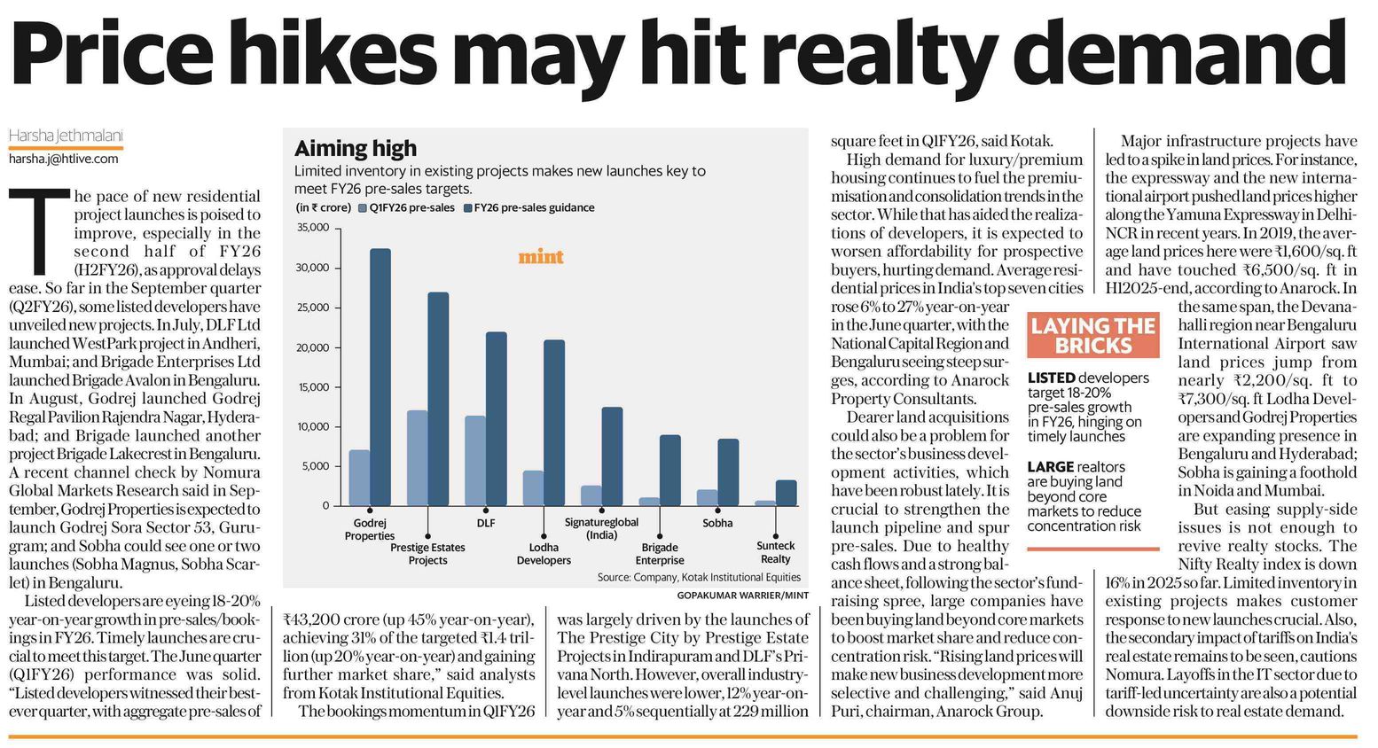 The article discusses how rising prices could negatively impact the demand for real estate. Increased costs may deter potential buyers, leading to a slowdown in the market. This has implications for developers, investors, and homeowners alike.Residential project launches aim to improve in the second half of FY26. Developers have unveiled projects in Q2FY26, with Godrej expected to launch Godrej Sora Sector 53, Gurugram. Listed developers target 18-20% growth in pre-sales. Infrastructure projects have spiked land prices.