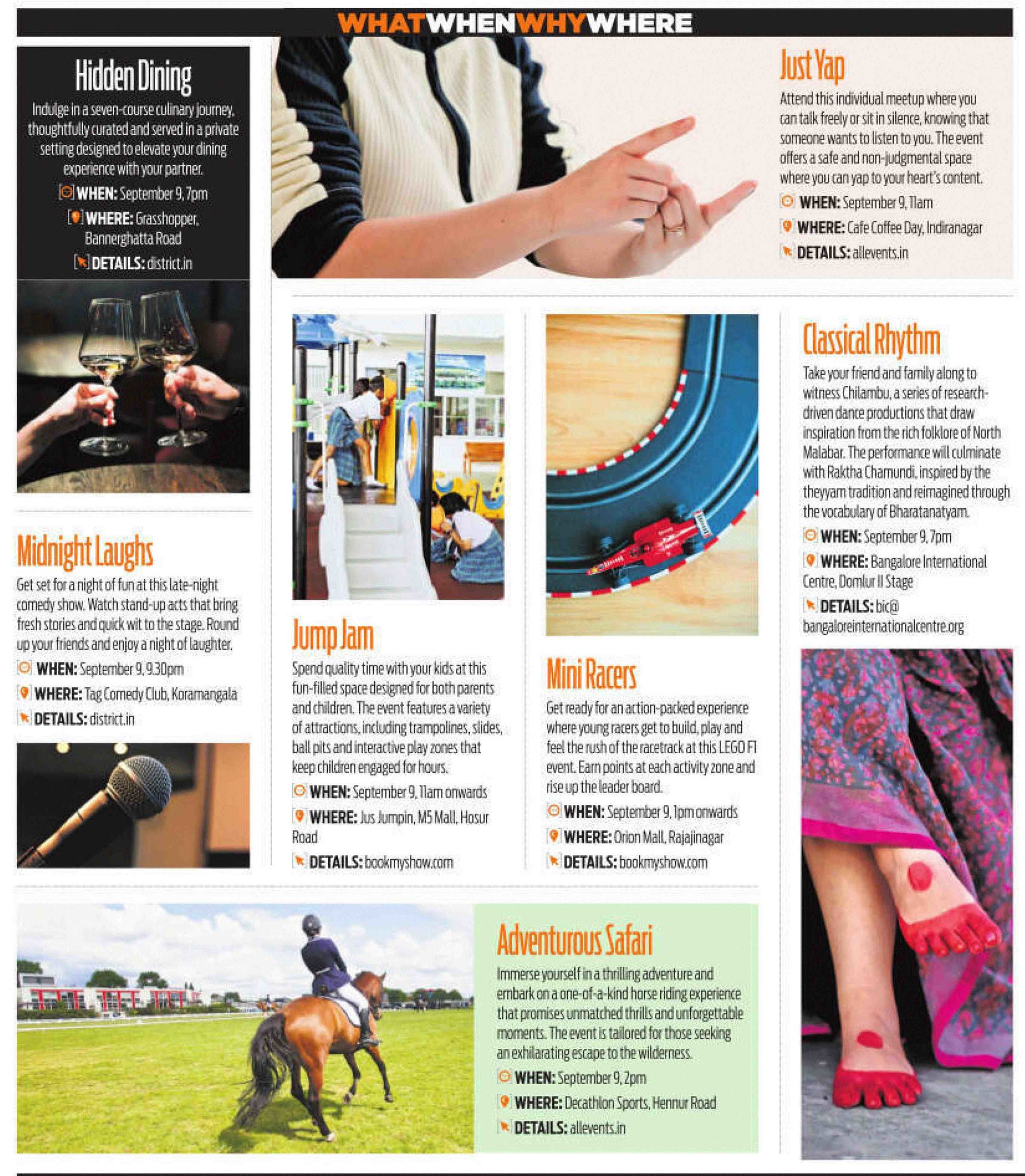 Get ready for a night of fun at this late-night comedy show. Watch stand-up acts that bring fresh stories and quick wit to the stage. Round up your friends and enjoy a night of laughter. When: September 9, 9.30pm. Where: Tag Comedy Club, Koramangala. Details: district.in.