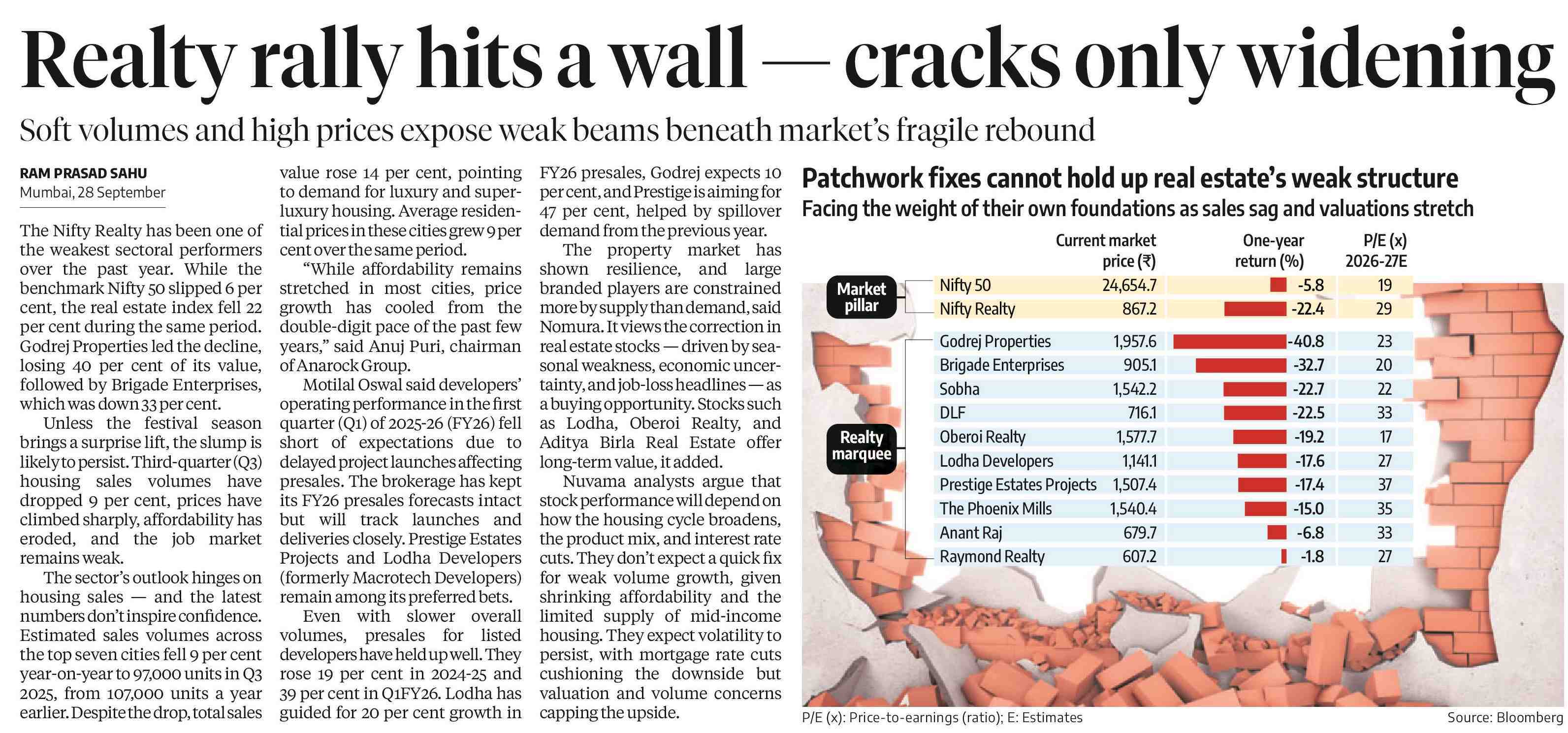 The Nifty Realty has been among the weakest sectoral performers, with the real estate index falling 22%. Housing sales have dropped 9% in Q3, and the sector's outlook is uncertain. Despite an overall drop, total sales value rose 14%, driven by luxury housing demand. Property market is constrained by supply.